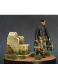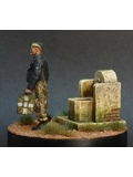 A Panzer Crew Man (Pegaso Models PT-035, Platoon Series) is out looking for water in 1944. Master painter Stelios Demiras painted the pants in Erbsenmuster pattern following Calvin Tan's recipe (perfect instruction on his site). The jacket was made a leather one using Panzer Aces system and some varnish. The face was painted using the Panzer Aces system. For the water canisters he used chipping method, filtering and Tamiya masking tape for the painting of the white stripes. The Small Well is from Monroe Perdu (MPD-010) and the wooden base is a special order and painted satin black. Most of the well was painted using oils. We hope that you like it.